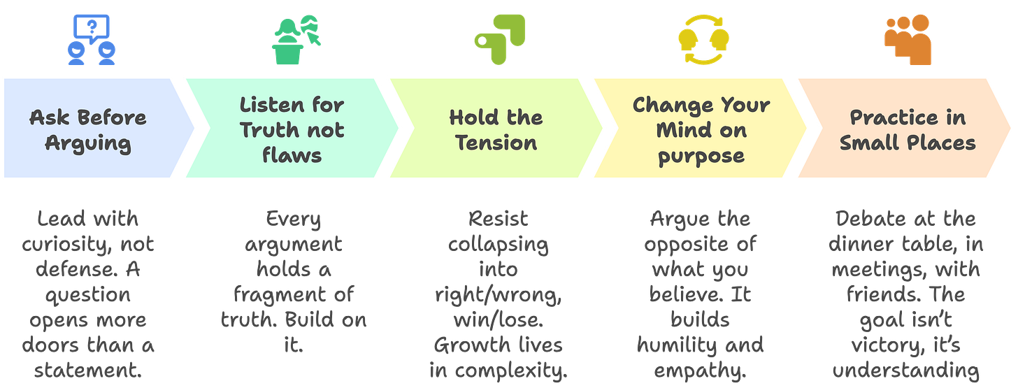 This brings us full circle back to debating, If debate is the metaphor and the training ground, then we need to practice it again. Not as performance, but as discipline. Not to win, but to understand.